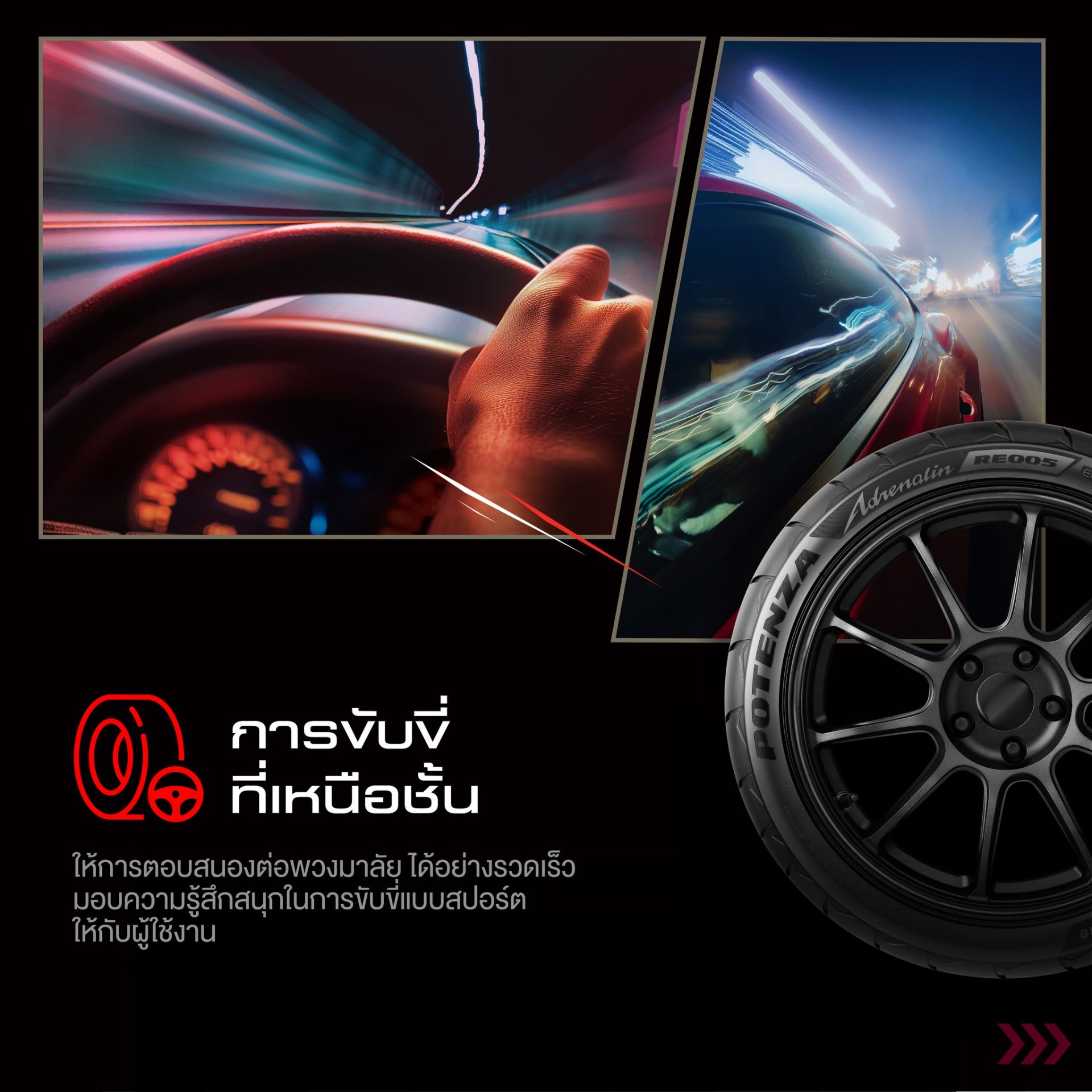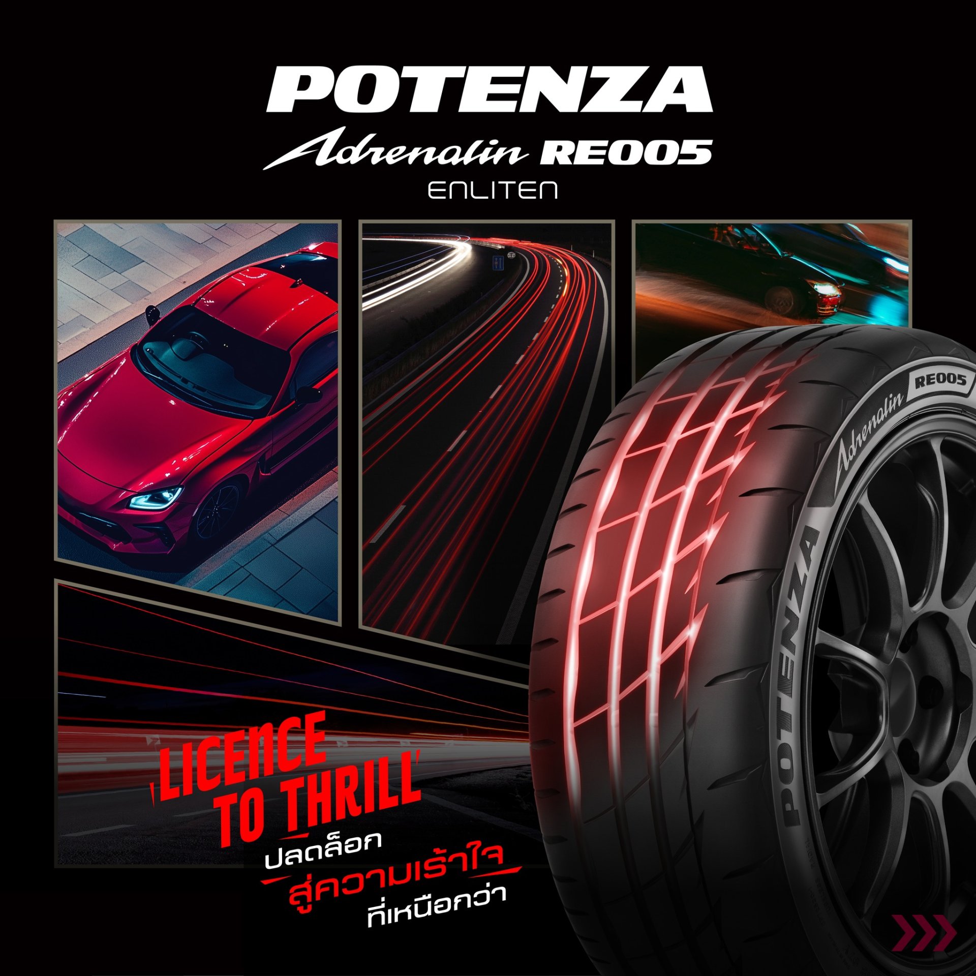 ปลดล็อกสู่ความเร้าใจที่เหนือกว่า POTENZA ADRENALIN RE005 ออกแบบและพัฒนาเพื่อการขับขี่ที่เหนือชั้น อีกขั้นของนวัตกรรมเพื่อความมั่นใจทุกการควบคุมบนถนนเปียกและแห้ง โครงยางแบบสปอร์ต ผสานเทคโนโลยีประหยัดพลังงาน คงสมรรถนะสายสปอร์ตอย่างเต็มที่ และคงประสิทธิภาพการใช้งานยาวนาน